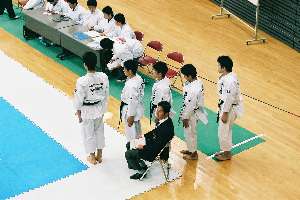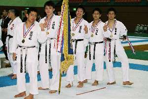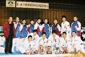 【 2004年 5/4 】 団体組手(勝抜戦方式)初優勝 1回戦 シード 2回戦 対:水俣戦 4人残し(先鋒稲5人抜) 3回戦 対:大阪学芸戦 4人残し(先鋒稲5人抜) 4回戦 対:嵯峨野戦 1人残し 準々決勝 対:開新戦 2人残し 準決勝 対:柏原戦 ×伊藤 3−6 ○蔵永/ ×三木 3−6 ○蔵永 ○浦野 6−1 ×蔵永/ ○浦野 6−1 ×平野 ○浦野 4−1 ×下島/ ×浦野 4−5 ○松下 ○稲 3−0 ×松下/ ○稲 5−2 ×藤田 決勝 対:宮崎第一戦 ○三木 6−0 ×野村/ ○三木 6−4 ×新名 ×三木 3−4 ○藤田/ ○伊藤 6−1 ×藤田 ○伊藤 6−3 ×谷崎/ ×伊藤 4−6 ○甲斐 ×浦野 4−6 ○甲斐/ ○稲 6−5 ×甲斐